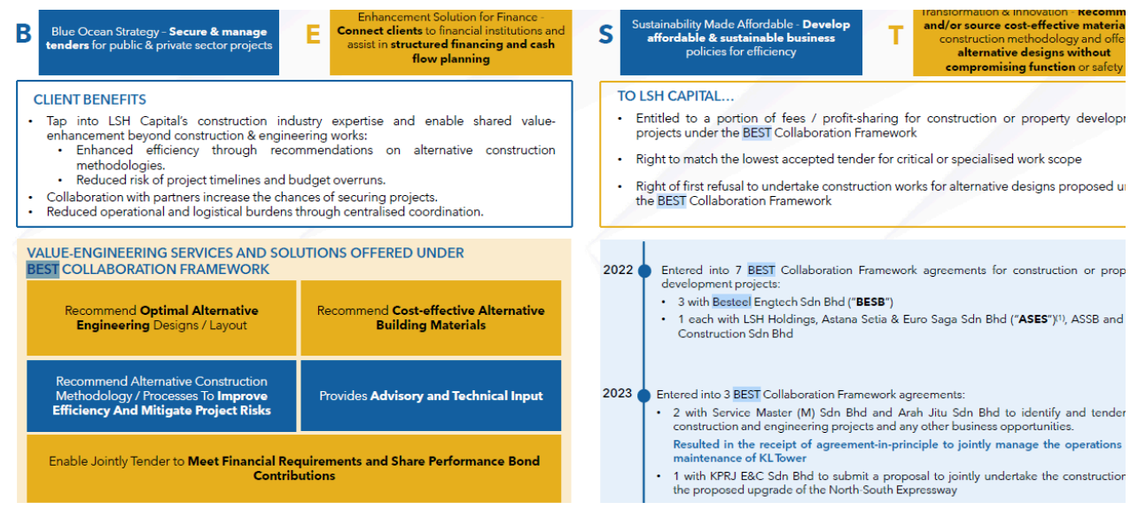 The BEST Collaboration Framework (Blue Ocean, Enhancement, Sustainability and Transformation) is an in-house delivery model introduced by LSH Capital to enhance cooperation with project owners. Under this framework, the group works with clients from the design and tender stages through to completion, providing value-engineering input, financing support, and sustainability solutions. This model allows LSH to participate early in project planning, improve technical coordination, and build long-term client partnerships. Although the commercial structure of each collaboration is not publicly disclosed, the framework has helped the group strengthen project visibility and differentiate itself from conventional contractors.