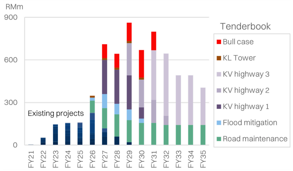 able to secure roughly RM2.6bn in contracts in our base case. This includes one of the highway alignments. In addition to this, there is a bull case land-swap project, within the forecast period.