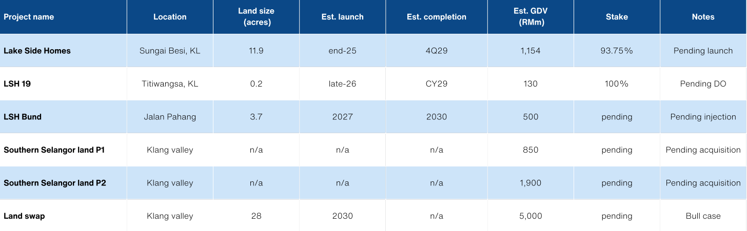 Lake Side Homes is the next project slated for launch (end-2025) with a GDV of RM1.15b and a projected gross margin of 32.2%. Preliminary construction work is already underway.
