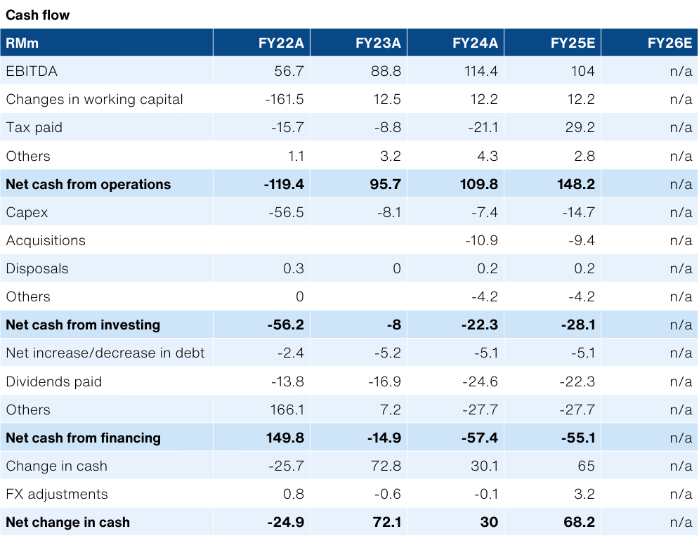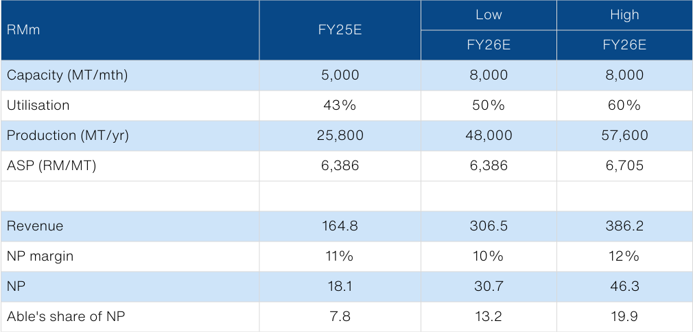 Against the higher production capacity base, management is also guiding for higher utilisation of 50-60%. This implies potential revenue lift of +86% to +136% YoY. The more conservative end of that assumption translates to aforementioned RM13m NP contribution. However, more bullish assumptions would translate to RM20m NP contribution (60% utilisation) or +18% NP upside vs FY25.