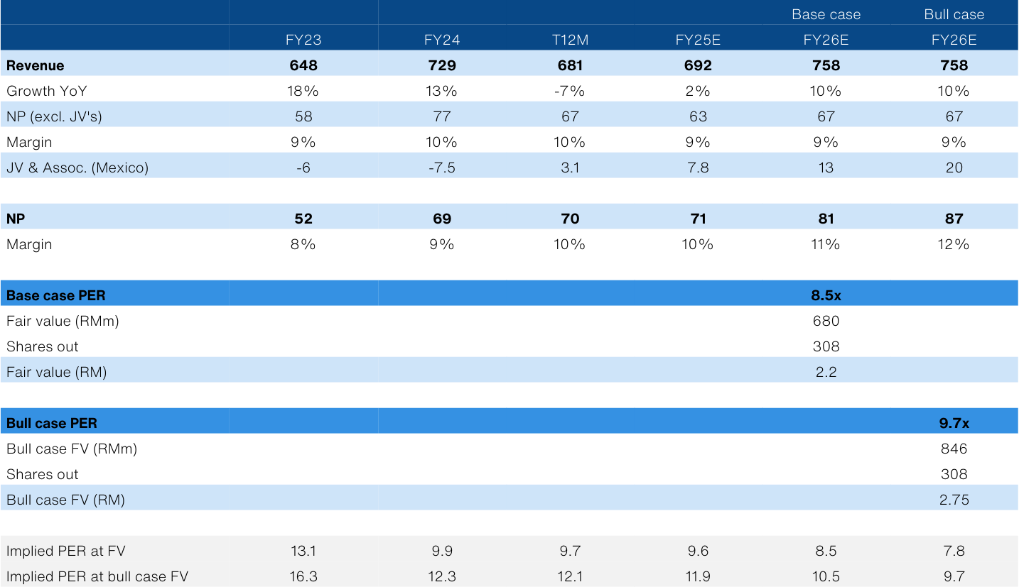 Our bull case scenario suggests a FV of RM2.75 - based on a further +RM7m NP upside from Mexico operations coupled with a re-rating back to the pre-MACC average PER of 9.7x.