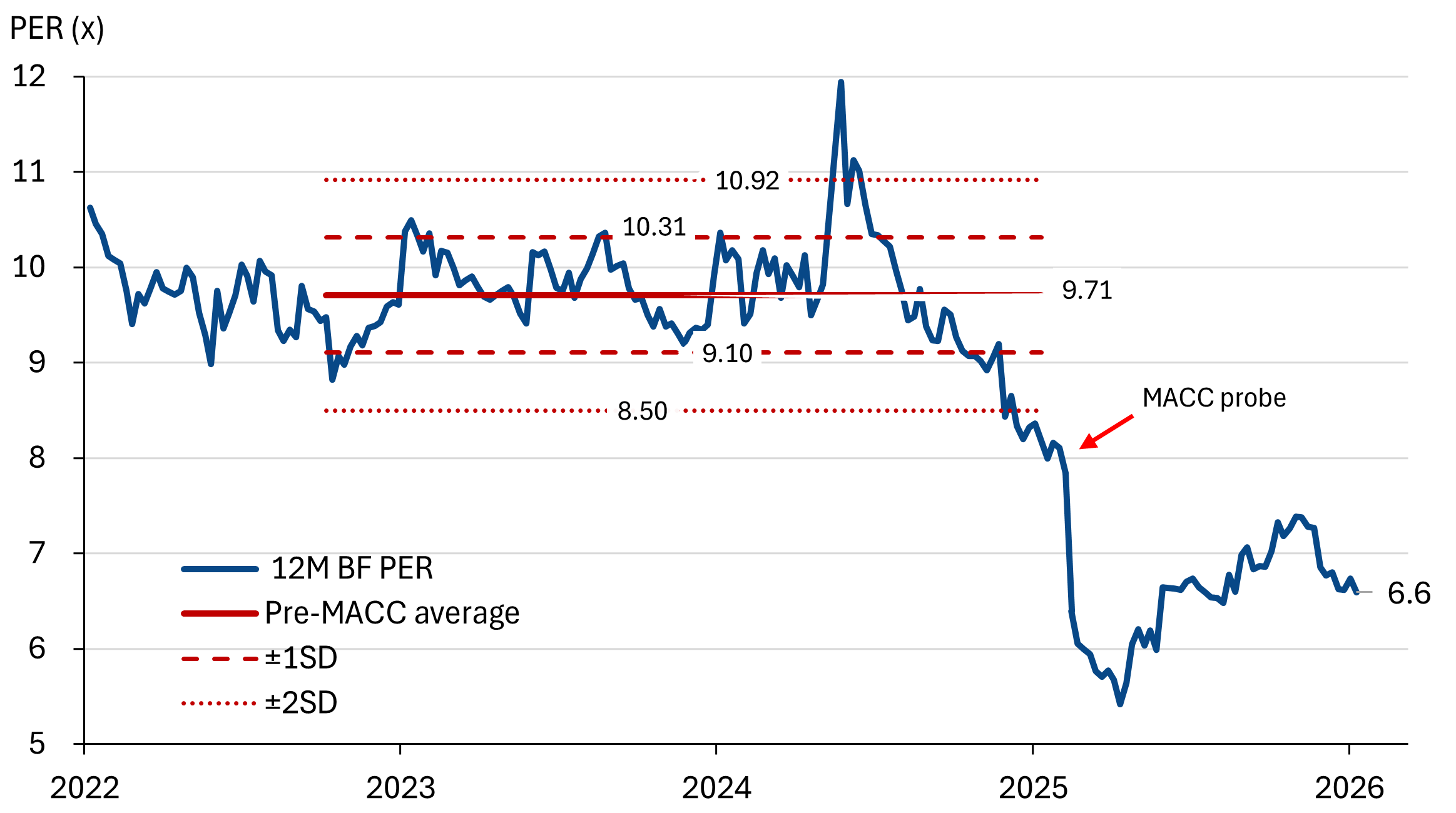 The stock saw valuations drop following probes by the anti-corruption agency into the company and management. But even though all the investigations have been dropped, the stock continues to trade at 6-7x PER, well below its historic pre-MACC average of 9.7x.