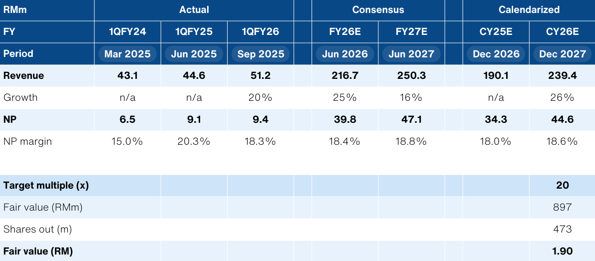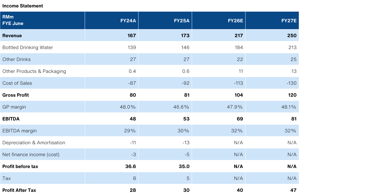 Life Water reported 1QFY26 revenue of RM51.2m (+20% YoY), marking a clear step-change from the RM44.6m run-rate recorded in 1QFY25. Annualising the 1QFY26 performance implies a revenue run-rate of RM205m, already covering 95% of FY26 consensus revenue expectations of RM217m, providing strong early-year earnings visibility.