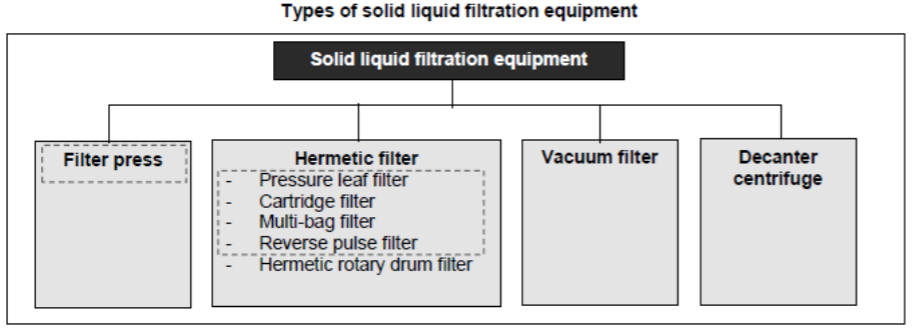 In brief, PMI specializes in filtration equipment for the purpose of separating solids from liquids by applying pressure. This takes the form in either filter presses or hermetic filters. Other filtration types include vacuum and decanter filters.
