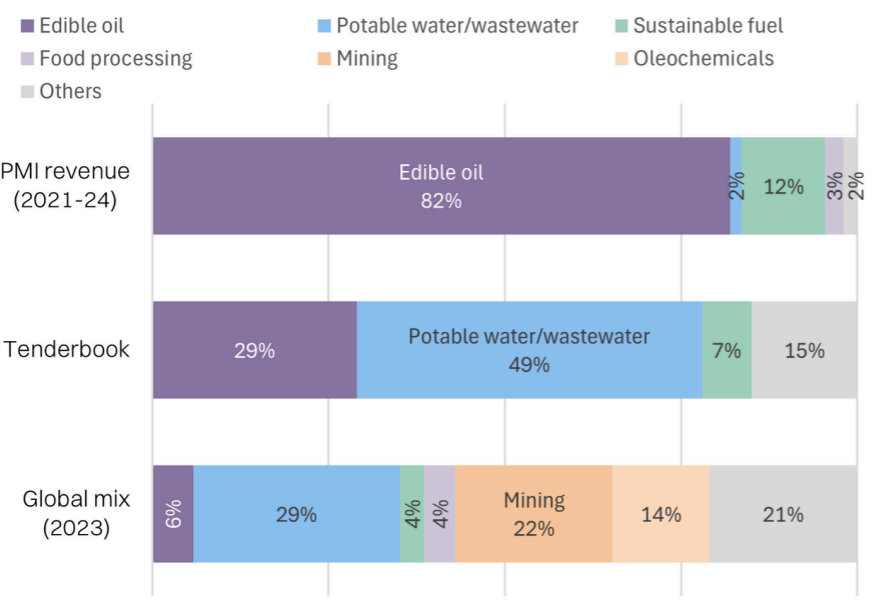PMI’s segmental focus on edible oils is also not reflective of the broader market demand for said filters, given it is only ~6% of total filter applications (2023) but 82% of PMI’s historic revenue mix. This further underscores the importance of PMI’s diversification into other end-segments.
