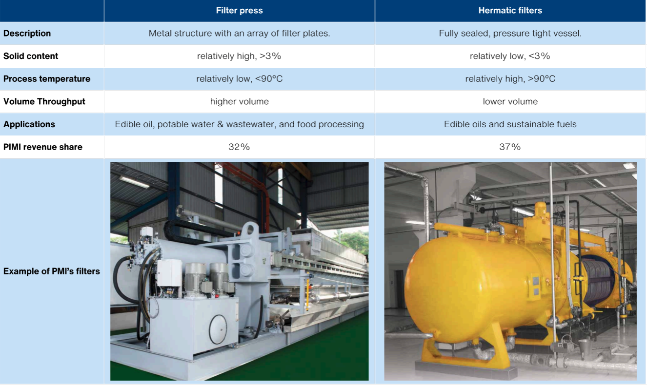 PMI supplies both filter presses and hermetic filters to the edible oils industry. However, it is the application of the two technologies is quite different. Filter presses that have the most immediate upside for PMI due to its potential application in waste management for water treatment.