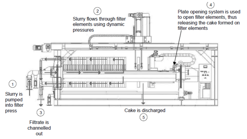 A filter press works by pumping slurry in and applying dynamic pressure. This allows an even distribution of slurry over the filter elements. This will allow the trapping and accumulation of solid particles (also known as cake) on the filter elements. The liquid portion or filtrate is channeled out of the press.