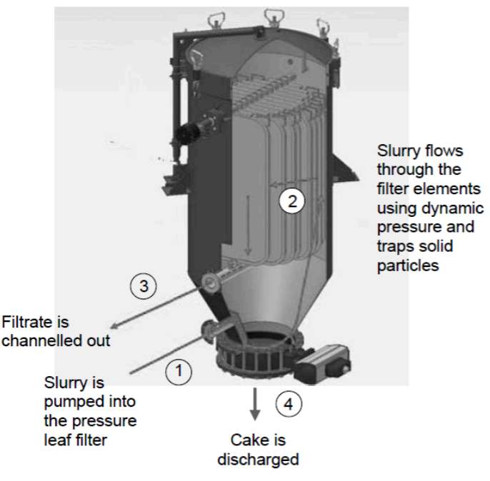pressure vessel to force the slurry to pass through the filter elements. Solid particles are then trapped on the surface of the filter elements, forming a cake while the liquid filtrate passes through.
