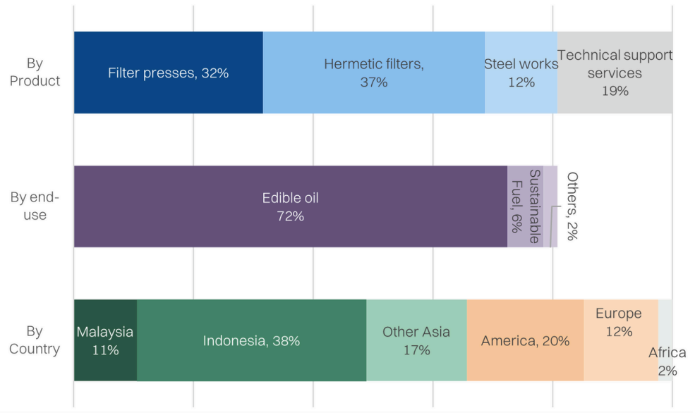 PMI specializes in manufacturing filter presses for liquid-solid separation. The primary application for the presses is in edible oils, and mainly for crude palm oil processing. The secondary application is within waste management, including water treatment as well as mining. This gives PMI potential as an ESG play. PMI is primarily an exporter, with over 85% sales coming from abroad, including countries like Indonesia, Europe, and US.