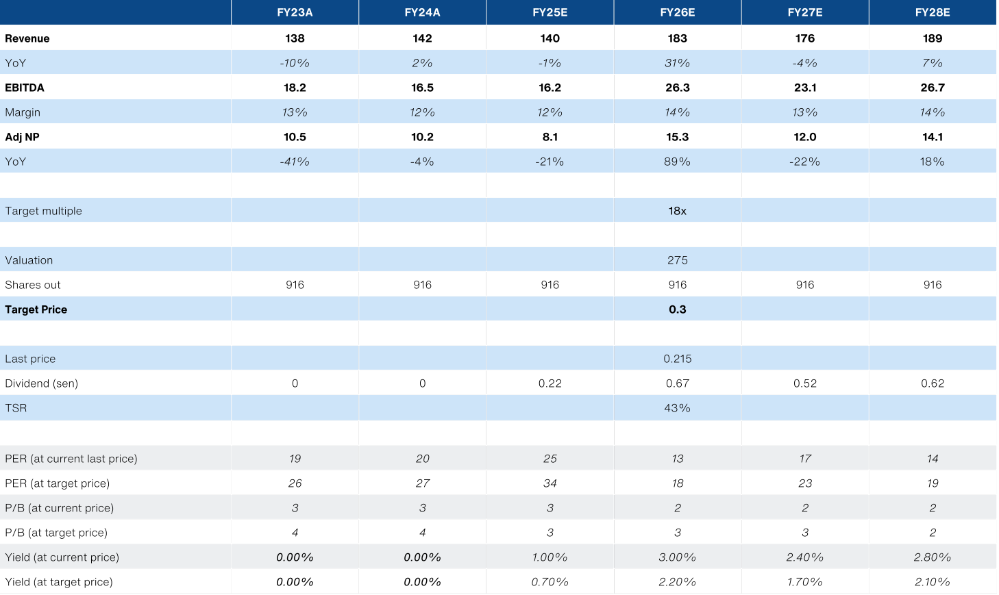 RM0.30. This implies a +29% TSR. We think this multiple is reasonable given the