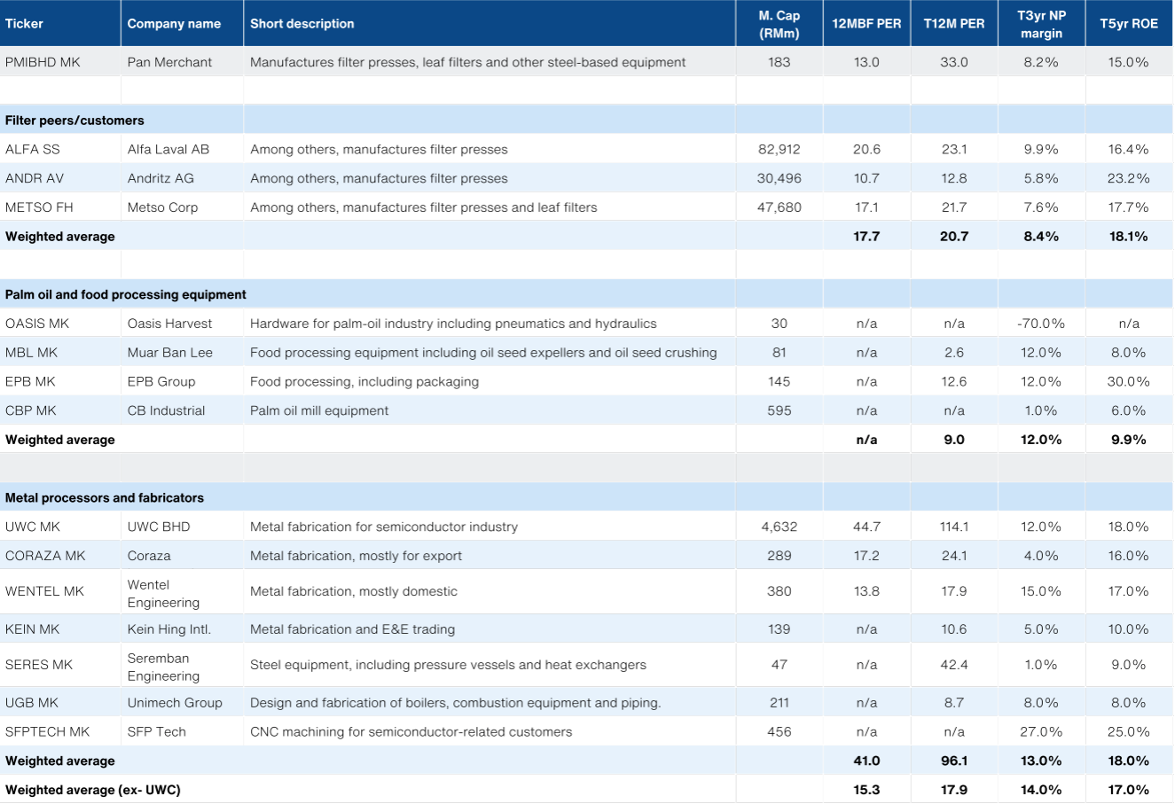 With limited listed track record, PMI has little valuation information to benchmark against. Instead, we look to peer valuations. There are no meaningful direct comps in Malaysia. Companies that are directly in the filter segments include Alfa Laval, Andritz and Metso - which double as both customers and suppliers. Valuations for this group are around 18x forward PER