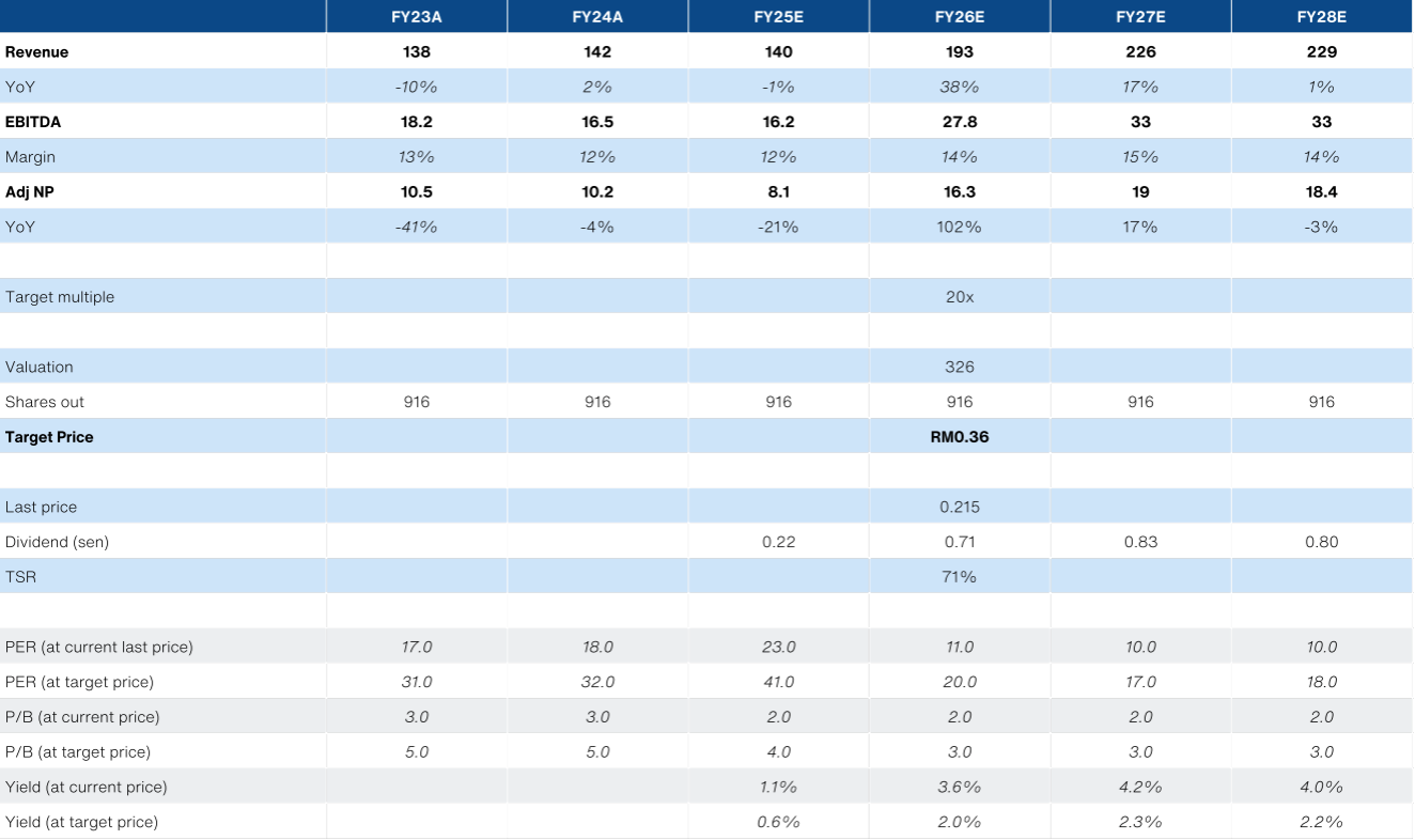 - Initiate with a BUY. Our RM0.30 TP is pegged to 16x FY26 earnings. Our RM0.36 bull case FV assumes a RM100m HK water project win.