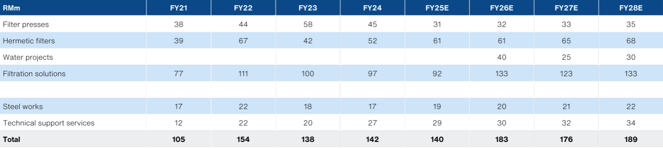 - The primary catalyst for our thesis is the potential award of up to RM100m of domestic water treatment related filtration works in Malaysia. We believe the project in question is Rasau Water Treatment plant in Selangor, that is now slated for completion by end-2026. We forecast a +31% revenue growth and an +89% growth for PATAMI for FY26E, if phase 1 of this project is secured. We expect the project to be awarded within the next 3-6 months.