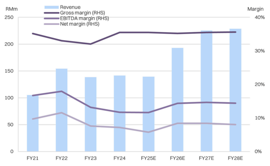 estimate that marginal sales above the current RM140m run rate should translate to a high-teens net margin (on incremental sales) compared with the current rate of ~6-7%. In turn, we forecast FY26E revenue growth of +31% YoY but a PATAMI growth of +89% YoY.