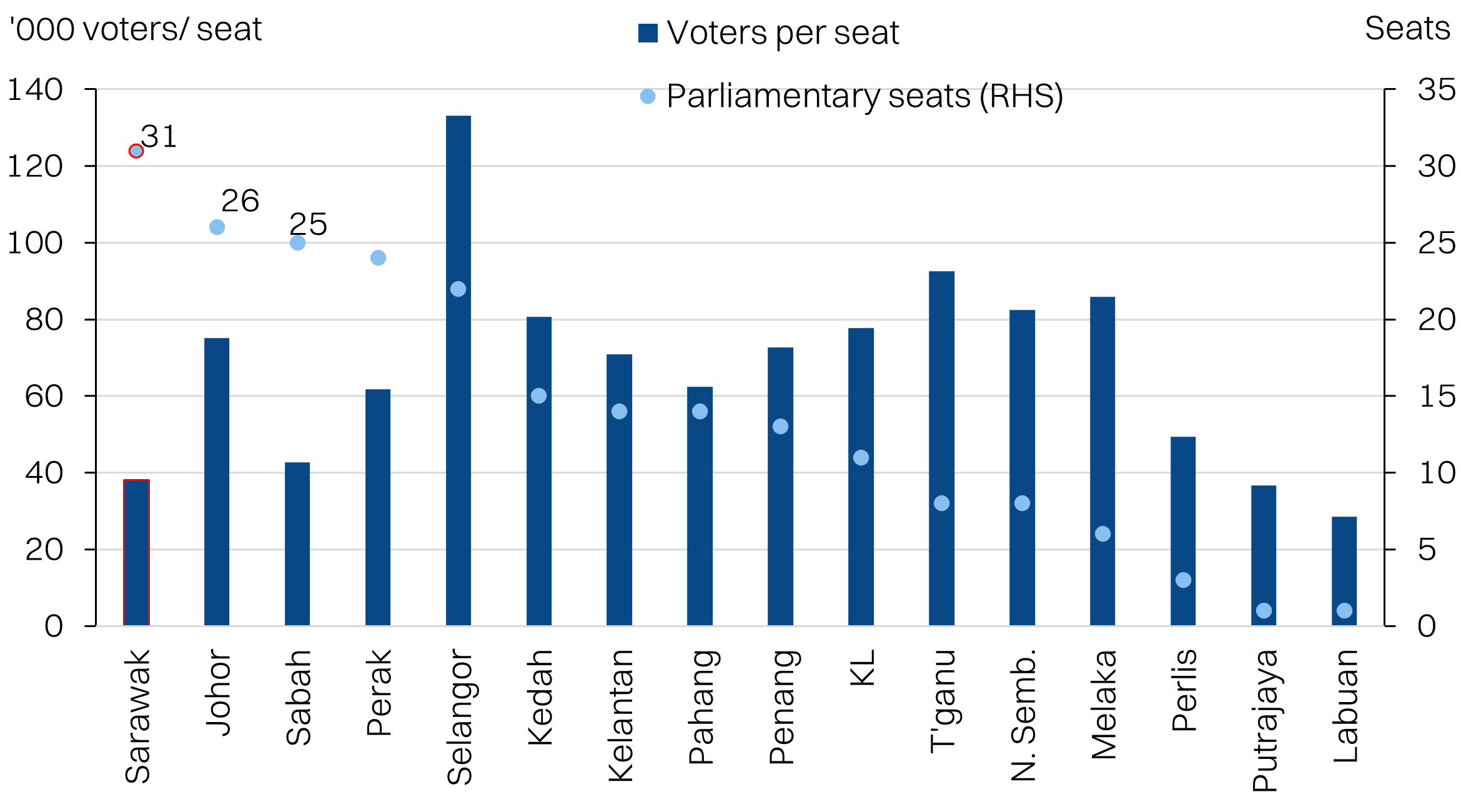 - As flagged in our first Politics, Policy, Profits report, the incremental political fragmentation in Peninsula Malaysia is shifting more political leverage towards the Borneo states of Sabah and Sarawak. Simply, it might be difficult for Peninsula-based coalitions to form a government with a simple majority with support from Sarawak (and Sabah).