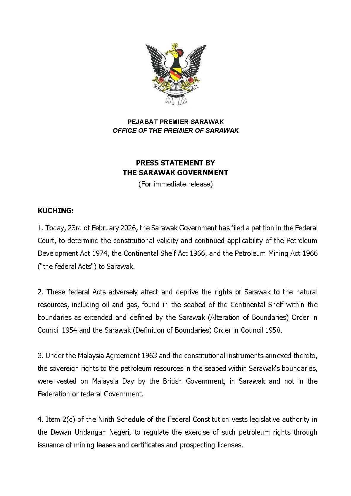 - We’ve attached the full press statement below. Sarawak appears to be challenging the applicability of the aforementioned acts, which currently confers mineral rights in the state to Petronas.