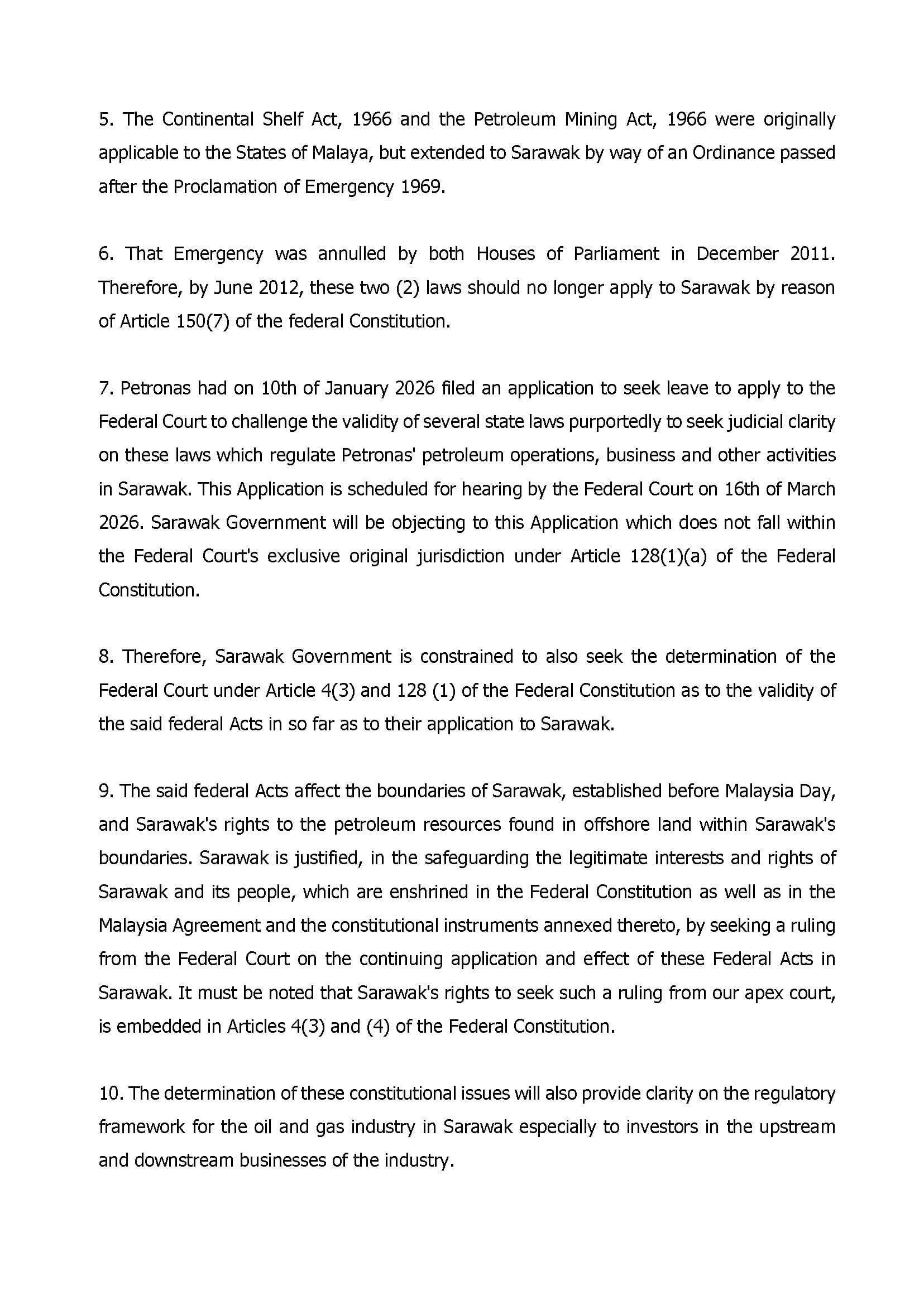 - Sarawak State’s filing with the apex court follows Petronas’ own filing (16 Jan), where the latter is seeking clarity on the legal position “legal position applicable to Petronas’ operations in Sarawak”.