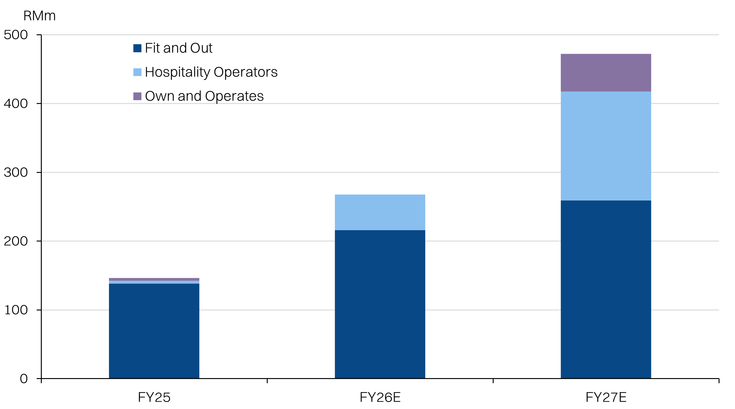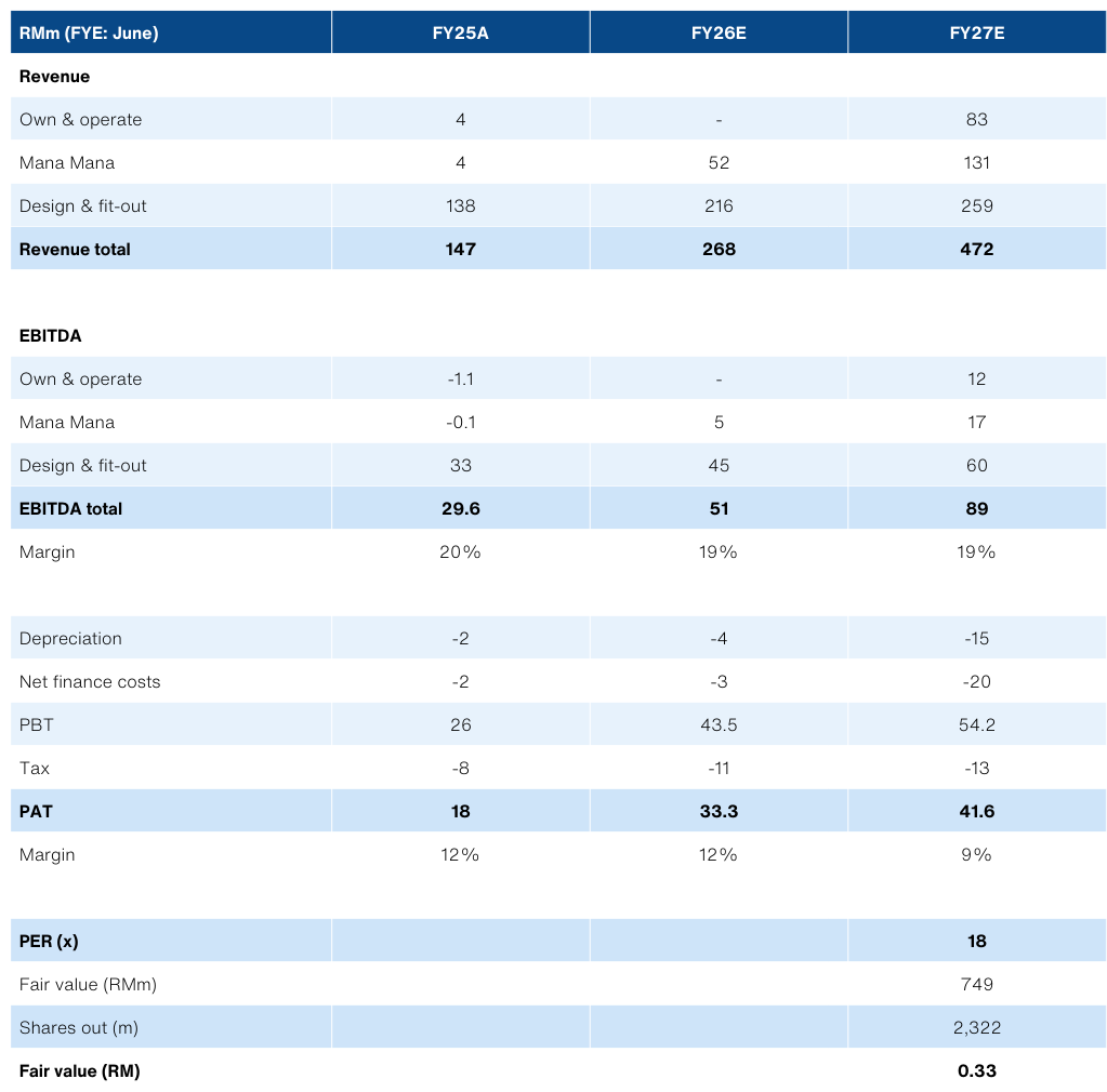 - We estimate earnings will grow by ~20% to RM41.6m by FY27E, albeit still anchored by the design and fit-out arm.